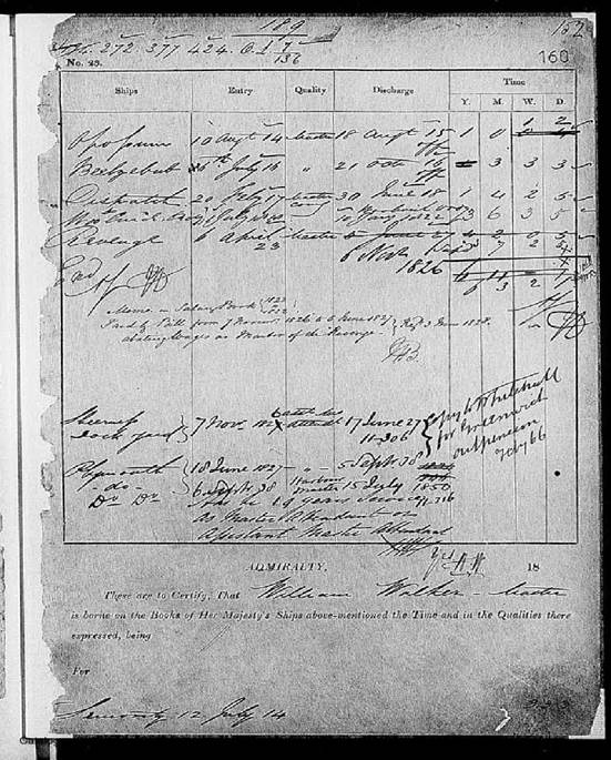 Cmdr. William Walker’s official service record in the RN. The other three ships he served on were HMS Opossum, HMS Beelzebub, and lastly HMS Revenge, all as Master(2nd in command to the captain). Note his artistic signature.